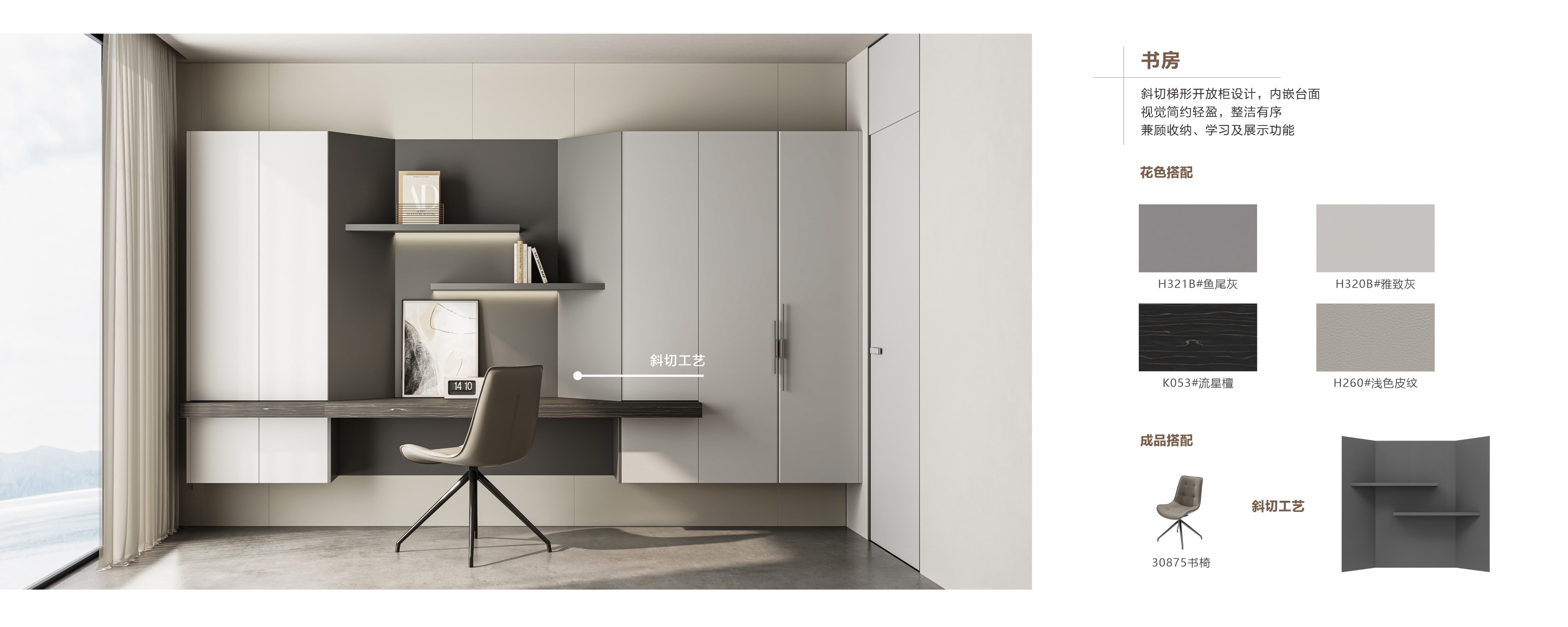 Thiết kế mở cửa tủ hình thang cắt kết hợp với mặt bàn đơn giản mà hiện đại, tăng khả năng trưng bày mà vẫn đáp ứng được chức năng lưu trữ.