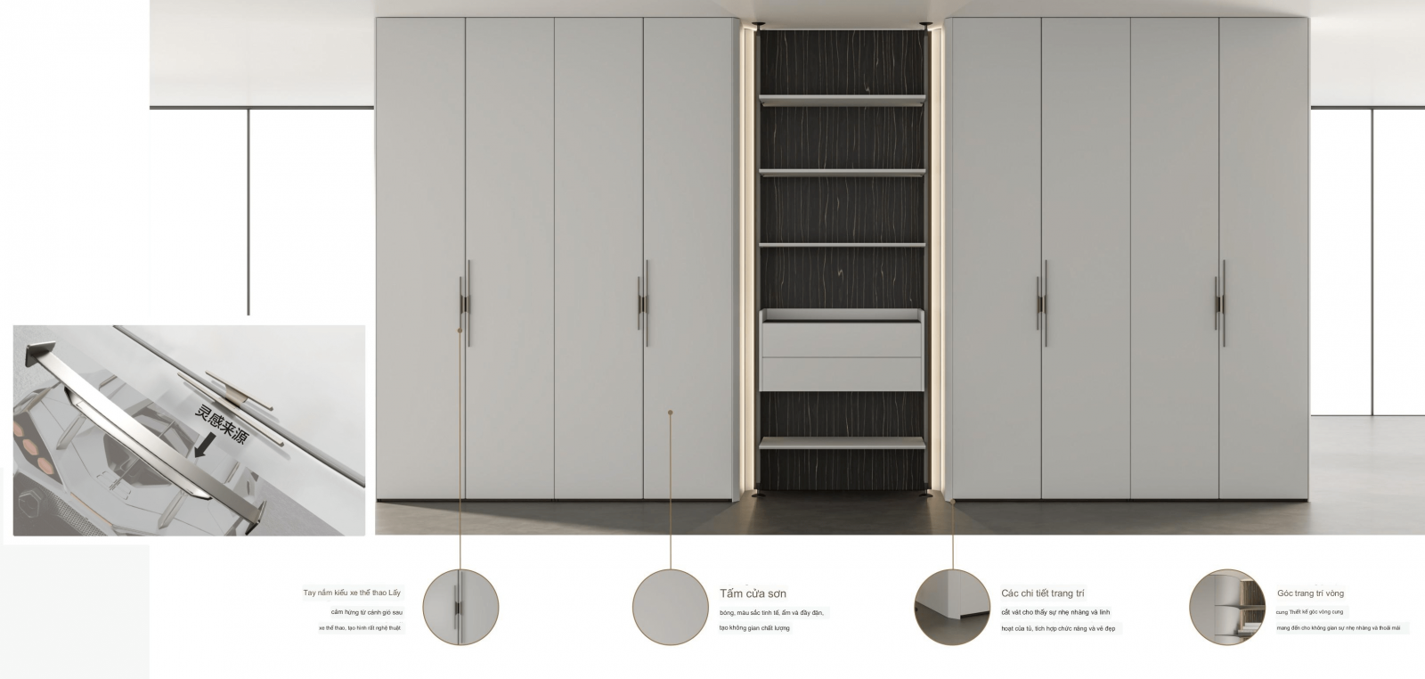 Thiết kế giá treo quần áo mở dễ dàng lấy quần áo hằng ngày. Bàn trang điểm treo tường tối giản và hiện đại. Tủ quần áo được thiết kế kết hợp thông minh, tạo 1 khoảng không gian trống ở giữa phân chia chức năng rõ ràng. Màu tối của gỗ đàn hương đan xen cùng màu xám nhạt và đậm mang đến cảm giác thanh lịch và sang trọng.